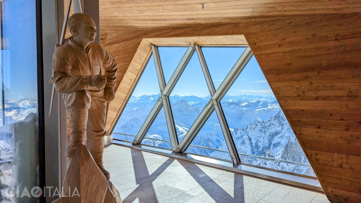 Urcând cele câteva trepte până pe terasa superioară, ți se va deschide o panoramă spectaculoasă spre Munții Alpi care te înconjoară. Se văd vârfurile Mont Blanc (4808m), Dente del Gigante (4013m), cu forma sa inconfundabilă și piramida de 4478m a Matterhornului (numit de italieni Monte Cervino), profilându-se în depărtare. În zare se distinge foarte bine și vârful Aiguille du Midi (3842m), ușor de recunoscut după turnul de telecomunicații care se află pe el.